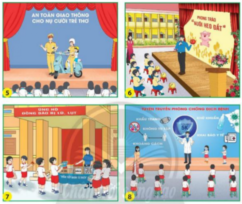 + Hình 7: Ủng hộ đồng bào bị lũ lụt: các bạn nhỏ trong hình đang quyên góp sách vở, truyện tranh, quần áo cho học sinh bị ảnh hưởng bởi lũ lụt: giúp các bạn học sinh ở vùng lũ có điều kiện đến trường và học tập tốt hơn; giáo dục cho các bạn học sinh về lòng nhân ái, tinh thần “lá lành đùm lá rách”.