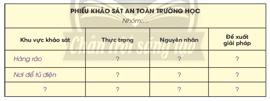 – Chuẩn bị khảo sát về sự an toàn trong khuôn viên nhà trường hoặc khu vực xung quanh trường học của em.
