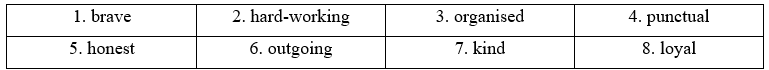 (Hoàn thành các câu với tính từ chỉ tính cách dưới đây. Có sáu tính từ bị thừa.)