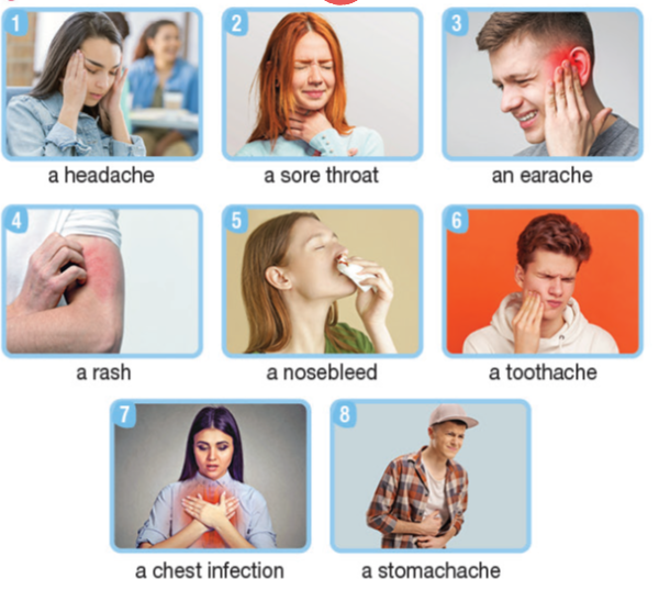 1. Listen and repeat. 2. Listen to the sentences. Underline the words with an /iǝ/ sound and circle the words with an /eǝ/ sound. Then listen again and repeat. Practise saying them with a partner. 3. Listen to Eric, An and Liam talking about health problems. Which health problems (1-8) in Exercise 1 did each have?4. When was the last time you suffered from any of the health problems (1-8) in Exercise 1? What did you do?