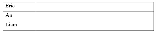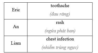 3. Listen to Eric, An and Liam talking about health problems. Which health problems (1-8) in Exercise 1 did each have?