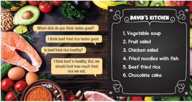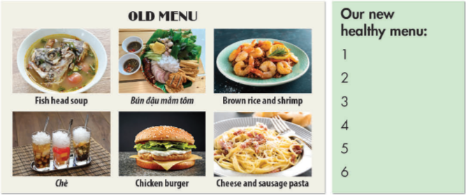 (Hãy tưởng tượng trường học của bạn muốn thực hiện một thực đơn bữa trưa lành mạnh hơn. Làm theo cặp: Nhìn vào thực đơn cũ và thảo luận xem món nào tốt cho sức khỏe và món nào không tốt cho sức khỏe. Quyết định món ăn nào nên được thay thế và tạo một thực đơn mới tốt cho sức khỏe.)
