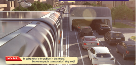 In pairs: What's the problem in the picture? Do you use public transportation? Why (not)? a. Find the words from the passage that match the definitions below. Listen and repeat. b. In pairs: Talk about the public transportation where you live, or in a place you know. a. Listen to city planners talking about a new form of public transportation. Do they all think it will have more advantages or disadvantages?b. Now, listen and match.
