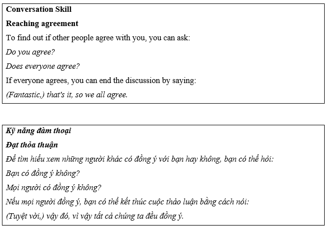 (Đọc hộp Kỹ năng đàm thoại. Sau đó, nghe và lặp lại.)