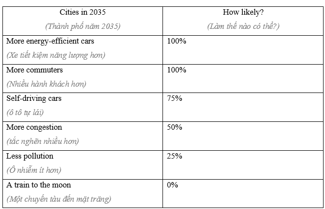 (Nhìn vào bảng và viết các câu để đưa ra dự đoán về các thành phố của chúng ta trong tương lai.)