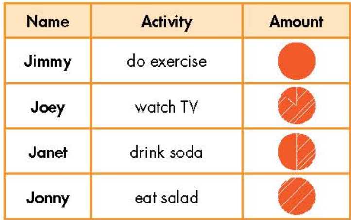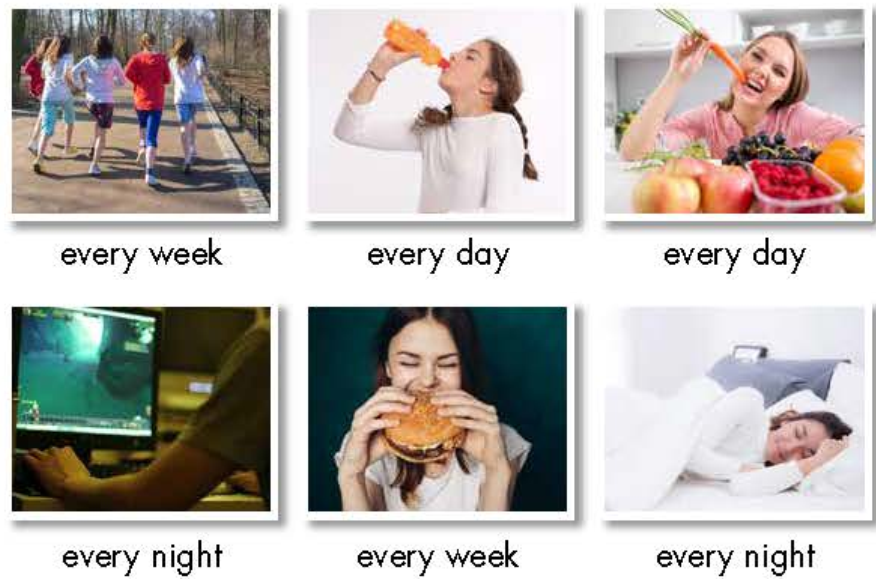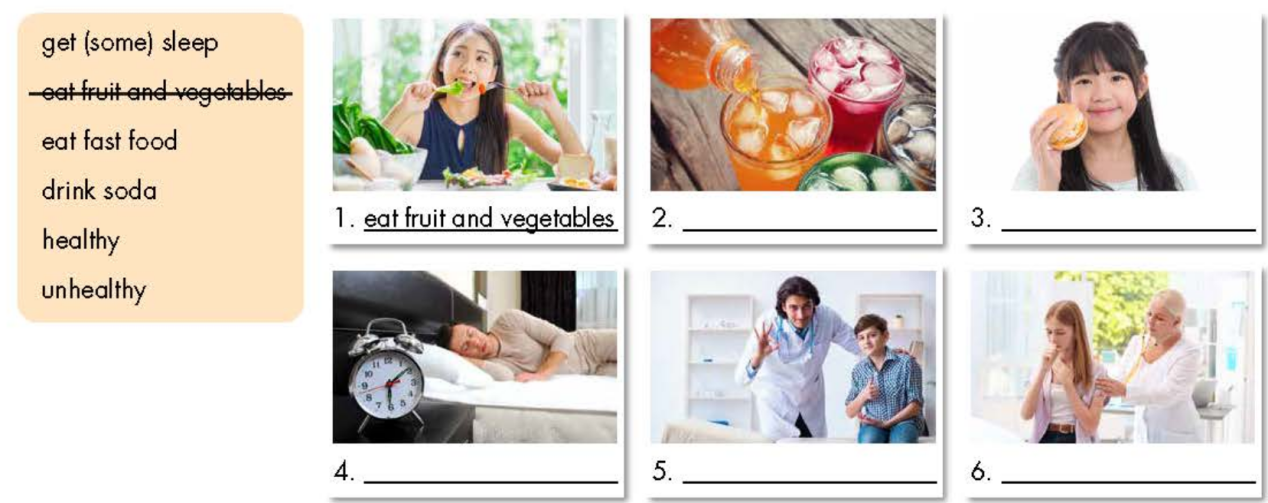 a. Match the words and phrases with the pictures. Listen and repeat. b. In pairs: Discuss which things are healthy and unhealthy. a. Read Toby and Lisa's class report and circle the correct answer. b. Now, read and circle the correct answers. c. In pairs: Do you have a healthy lifestyle? Why (not)? a. Listen and repeat. b. Circle the correct words. c. Look at the table and answer the questions. d. In pairs: Ask your partner about the activities in Task c. a. Intonation falls for Wh-questions. b