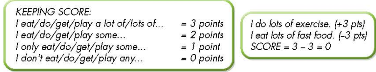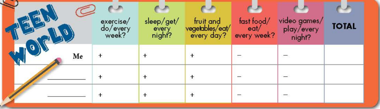 a. You’re doing a survey about healthy lifestyles. In threes: Fill in the survey for yourself, then ask two friends about their lifestyles. For each (+) answer, add points. For each – answer, subtract points.