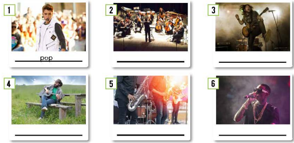 a. Match the words with the pictures. Listen and repeat. b. In pairs: Say which types of music you like and dislike. Describe them using the adjectives below. a. Read the blog posts. Do Binh and Linh both like rock music? b. Now, read and circle the correct answers. c. In pairs: When do you like to listen to music? . Listen and repeat. b. Circle the correct words. c. Write sentences using the pictures. d. In pairs: Ask and answer. a. Focus on different sounds /s/, /z/ of "s" at the end of verbs.