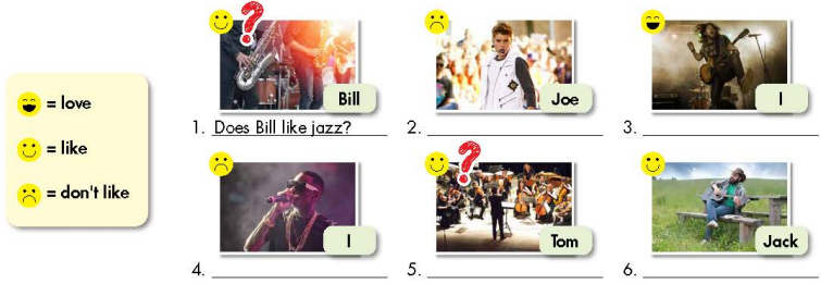 1. Does Bill like jazz? (Bill có thích nhạc jazz không?)