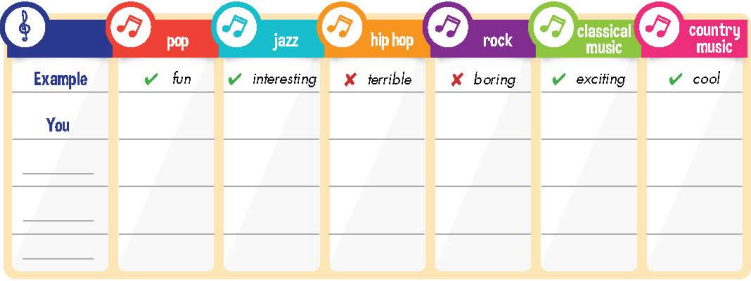 a. In fours: Fill in the table with your own information. Put a tick (v) if you like the music or a cross (X) if you don’t, and add an adjective to give your opinion. Then, ask three friends and complete the table.
