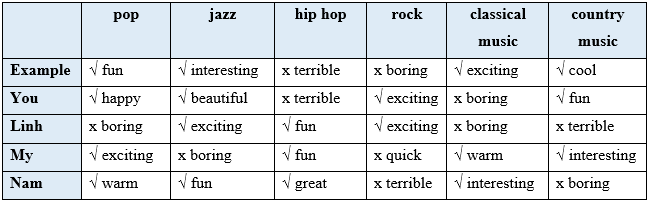 (Làm theo cặp: Nói loại nhạc nào bạn thích và không thích. Miêu tả chúng sử dụng những tính từ theo bên dưới)