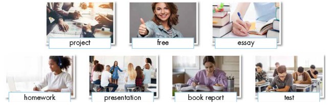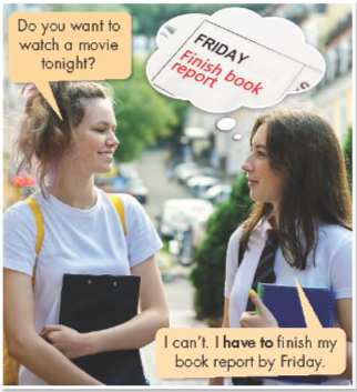 a. Match the words with the descriptions. Listen and repeat. b. In pairs: Say which things you have to do at school.a. Listen to two students trying to make plans. Who is busier?b. Now, listen and fill in the blanks.c. In pairs: Does your life sound more like Alan's or Lucy's? Why?a. Listen and repeat. b. Write sentences with have to using the prompts.c. Fill in the blanks with have to, has to, don't have to, or doesn't have to.d. In pairs: What things do/don't you have to do at home or at s