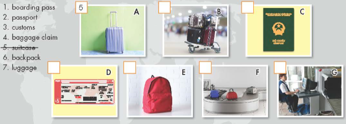 (Hoán đổi vai trò và lặp lại. Học sinh A, file 7 trang 21. Học sinh B, hỏi hành lý của bạn mình là cái nào. Chỉ và đoán. Sau đó điền số vào hộp.)