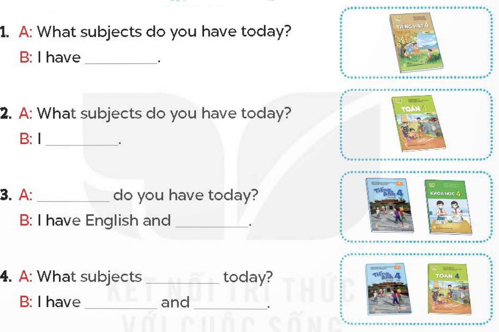 1. A: What subjects do you have today? (Hôm nay bạn có môn gì?)