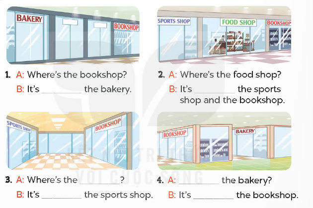 B: It’s between the sports shop and the bookshop. (Nó ở giữa cửa hàng thể thao và cửa hàng sách.)