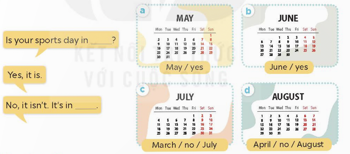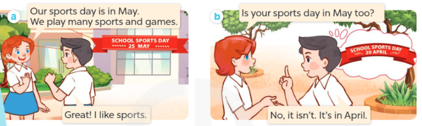 – Is your sports day in May? (Có phải ngày thể thao vào tháng 5 không?)