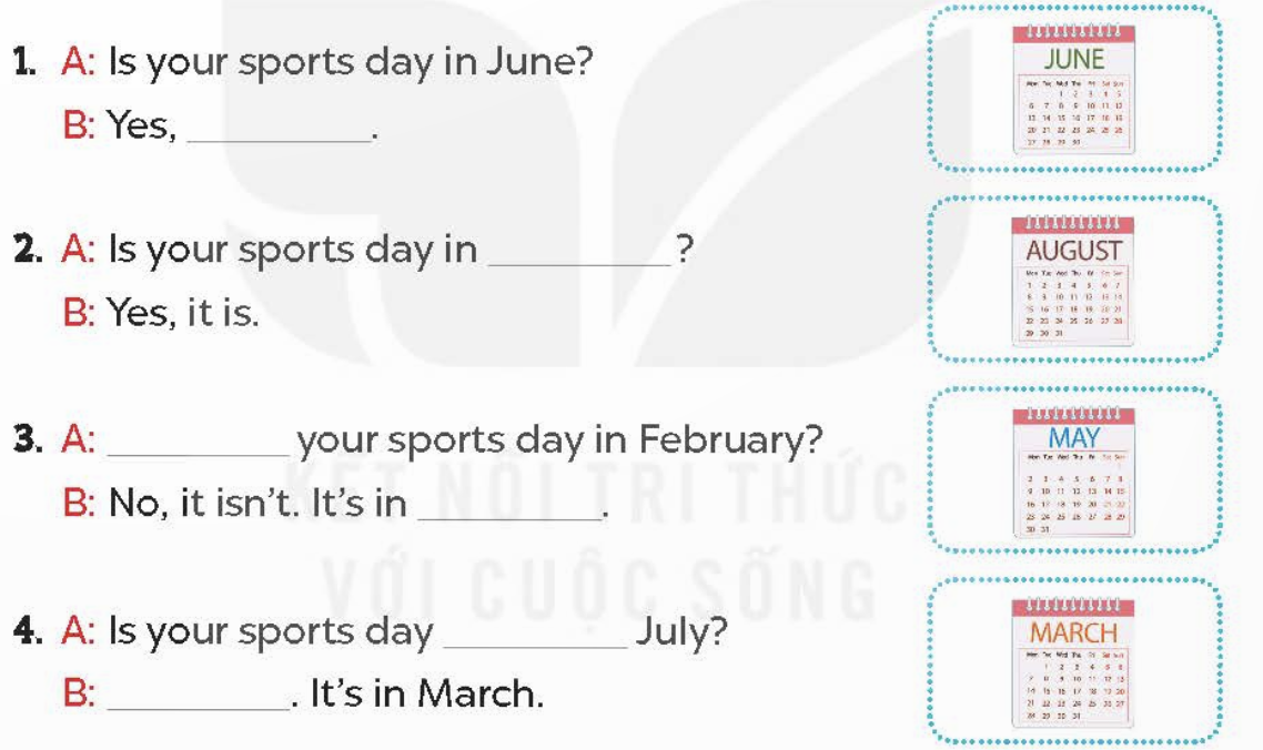 – Is your sports day in + tháng? (Có phải ngày thể thao vào tháng … không?)