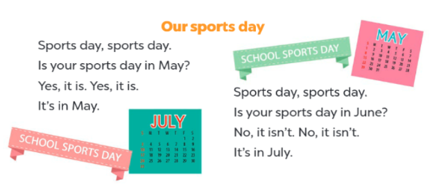 – Is your sports day in + tháng? (Có phải ngày thể thao vào tháng … không?)