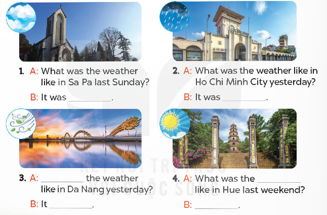 1. A: What was the weather like in Sa Pa last Sunday? (Thời tiết ở Sa Pa vào chủ nhật tuần trước như thế nào?)
