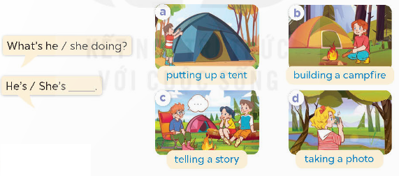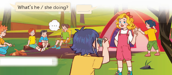 A: What’s he doing at the campsite? (Anh ấy đang làm gì ở khu cắm trại?)
