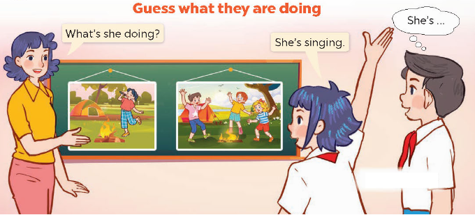 Cách chơi: Các em nhìn tranh, đoán xem các nhân vật trong tranh đang làm gì. Sử dụng những cấu trúc đã học.