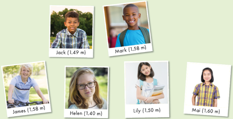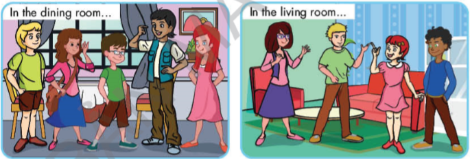 (Giúp học sinh A tìm bạn của họ. Hỏi những câu hỏi về các thứ như: tóc, chiều cao, và mắt kính. Sau đó, nói cho họ biết bạn của hok ở phòng ăn hay phòng khách.)