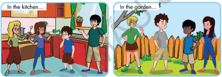 (Bây giờ, giúp học sinh B tìm bạn của họ. Hỏi về những điều này: tóc, chiều cao, quấn ào, và mắt kinh. Sau đó, nói cho họ biết bạn của họ ở trong bếp hay trong vườn.)