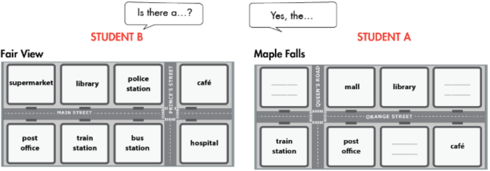 (Em đang tham quan một thị trấn mới. Làm việc theo cặp. Học sinh A, vẫn ở trang này và trả lời những câu hỏi của học sinh B về Maple Falls. Học sinh B, chuyển đến trang 122 File 5.)