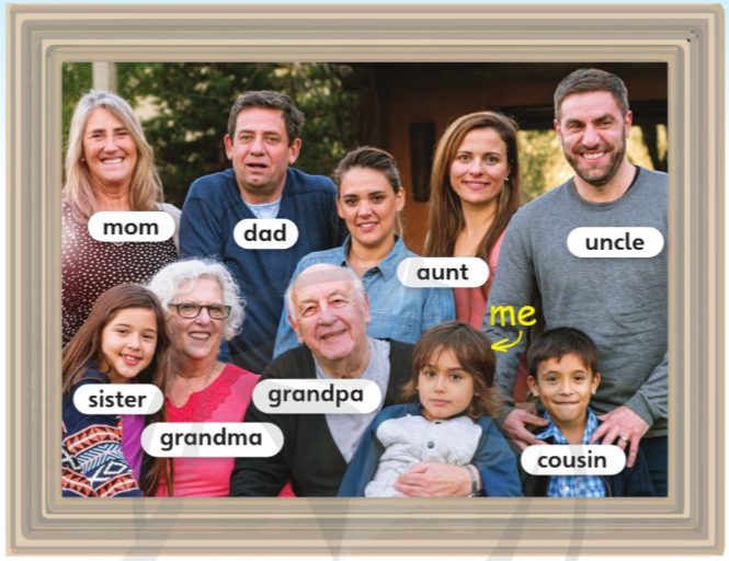 Look and listen. Repeat. Read. Listen and circle. Point to the picture in 1. Say. Draw your family. Say.