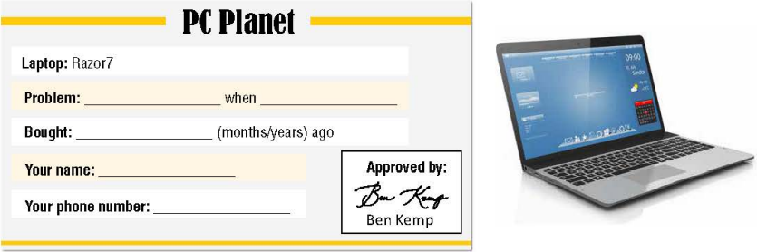 (Em gặp sự cố với chiếc máy tính xách tay của mình và muốn sửa nó ở cửa hàng nơi em mua nó. Theo cặp: Học sinh B, Học sinh A, hoàn thành ghi chú theo ý kiến của riêng em, sau đó trao đổi với người quản lý. Hoán đổi vai trò và lặp lại.)