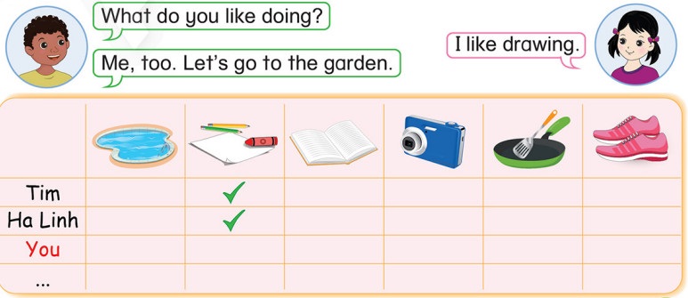 Ha Linh: I like drawing. (Tôi thích vẽ.)