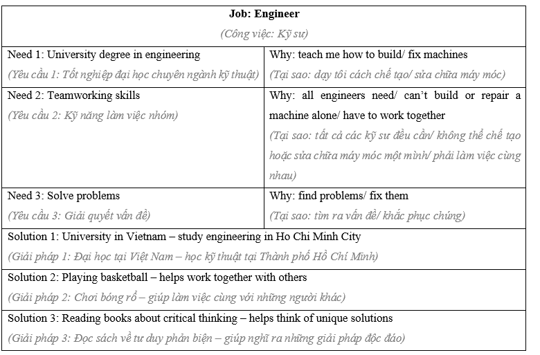 Tôi sẽ học đại học ở Việt Nam. Tôi dự định học ngành kỹ thuật tại thành phố Hồ Chí Minh. Tôi đã chơi bóng rổ với một đội. Nó giúp tôi làm việc cùng với những người khác. Tôi đã bắt đầu đọc sách về tư duy phản biện. Nó giúp tôi nghĩ ra những giải pháp độc đáo. Hy vọng rằng, sau khi đọc bài này, bạn có thể bắt đầu lập kế hoạch.