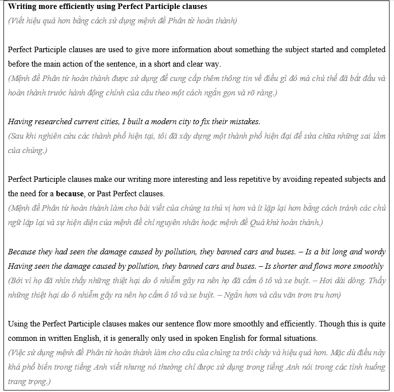 – Chuyển thành mệnh đề Phân từ hoàn thành bằng cách bỏ liên từ, bỏ chủ ngữ và đưa phần động từ về thành “Having P2”