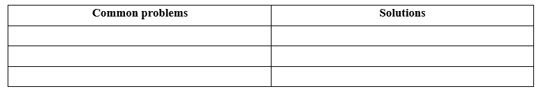 (Bạn đang thiết kế một thành phố cho một dự án trường học. Chọn ba vấn đề phổ biến mà thành phố của bạn sẽ giải quyết và đưa ra các giải pháp tiềm năng. Hoàn thành bảng dưới đây.)