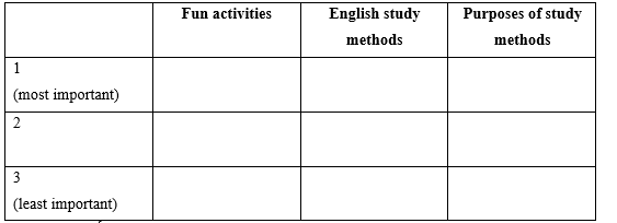 (Chọn ba hoạt động bạn có thể làm và quyết định thứ tự của tầm quan trọng, sau đó hoàn thành bảng sau.)