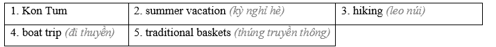 Thông tin: Nga: We joined lots of interesting activities. We watched a traditional music show and visited the Cơ Tu weekend market. We also had a barbecue and sat around a big fire in their yard. / we tried some Cơ Tu traditional foods. The food was delicious! I loved cơm lam and grilled meat, but my favorite dish was bánh sừng trâu. / We learned how to play the Cơ Tu musical instruments like góng and drums.