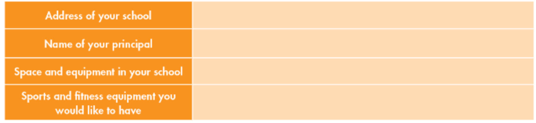 Think about sports and fitness in your school. Is there enough space to play sports and do exercise? What kind of sports equipment (bats, balls, table tennis) or facilities (swimming pool, football pitch) would you like to have? Complete the table about your school.