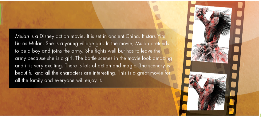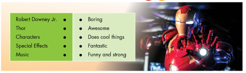 Listening a.Listen to a boy talking about Avengers: Endgame. Choose the correct answer. b. Now, listen and draw lines to connect the ideas. Reading a.Read the movie description and answer the question. Did the writer enjoy the movie?. b. Now, read and circle True or False. Writing skill: Read the movie description and rewrite it in the correct order. Planning: Make notes about a movie you did not like in the table below. Writing Now, use your notes to write a movie description. Write 60 to 80 w