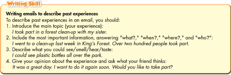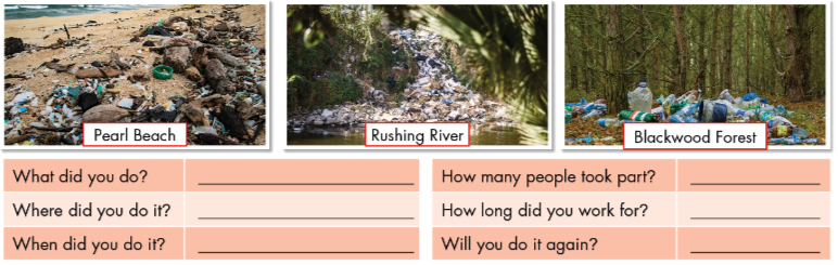 Listening a.Listen to a radio show. What kind of show is this?. b. Now, listen and fill in the blanks. Reading a. Read Tim's email to Alice. Would Tim like to take part in future clean-ups?. b. Now, read and answer the questions. Writing skill: Write full sentences using the prompts. Then, number the sentences (1-4) to match them with the order. Planing: Choose one of the places. Use your own ideas to fill in the tables about a clean-up there. Writing: Now, use your notes to write an email abou