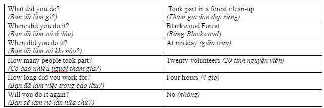 ( Tôi đã tham gia làm sạch sông ở Green Valley. Tôi đã đi dọn dẹp ngày hôm qua ở Gold Beach. Hơn hai mươi tình nguyện viên đã tham gia. Tôi có thể nhìn thấy thùng rác trên bãi biển. Thật là kinh khủng! Đó là một sự kiện thực sự vui vẻ. Bạn có muốn tham gia cùng chúng tôi vào năm tới không?)