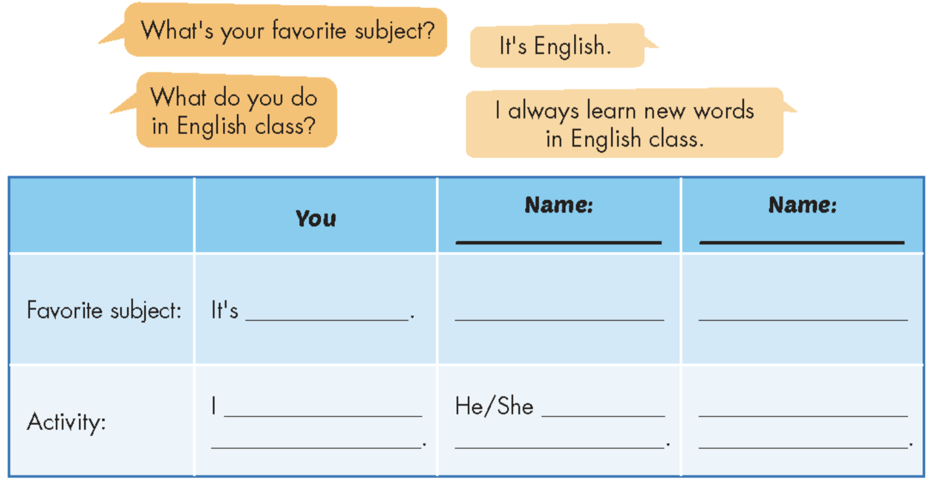 2. List other subjects and activities you do in them. Practice again.