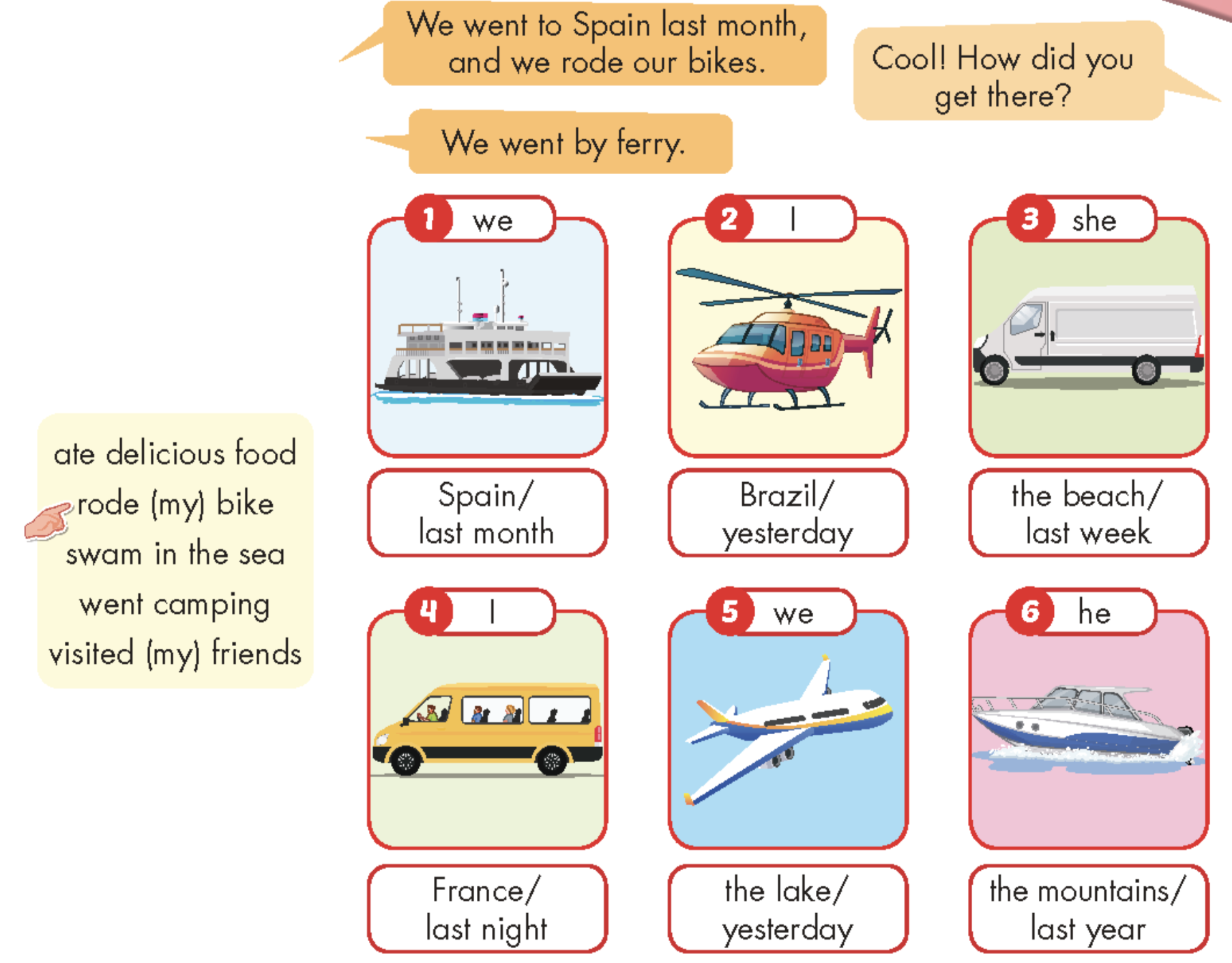 (Tôi đã đi leo núi tháng trước. Tôi đi bằng xe đạp.)