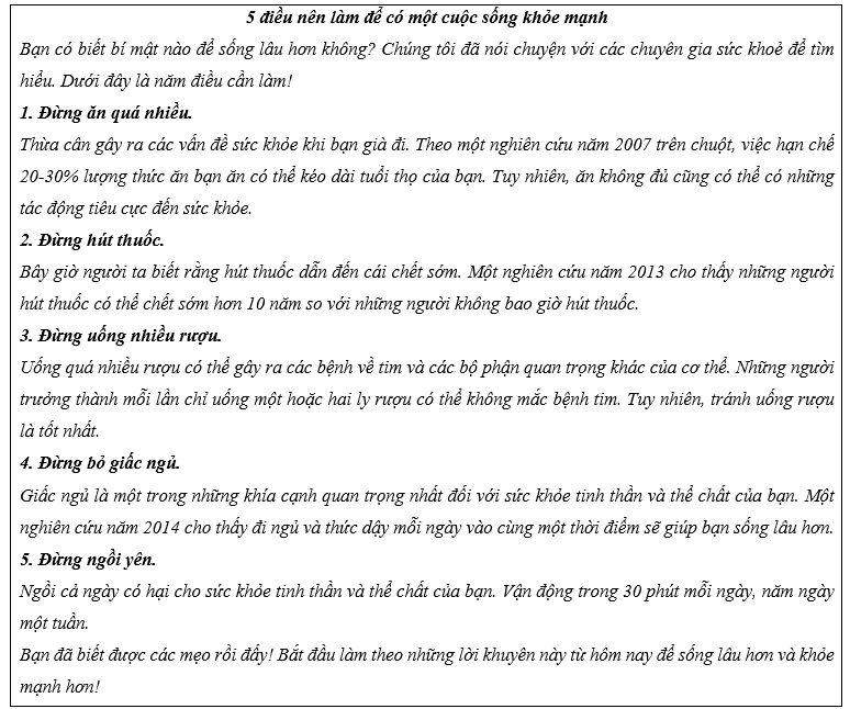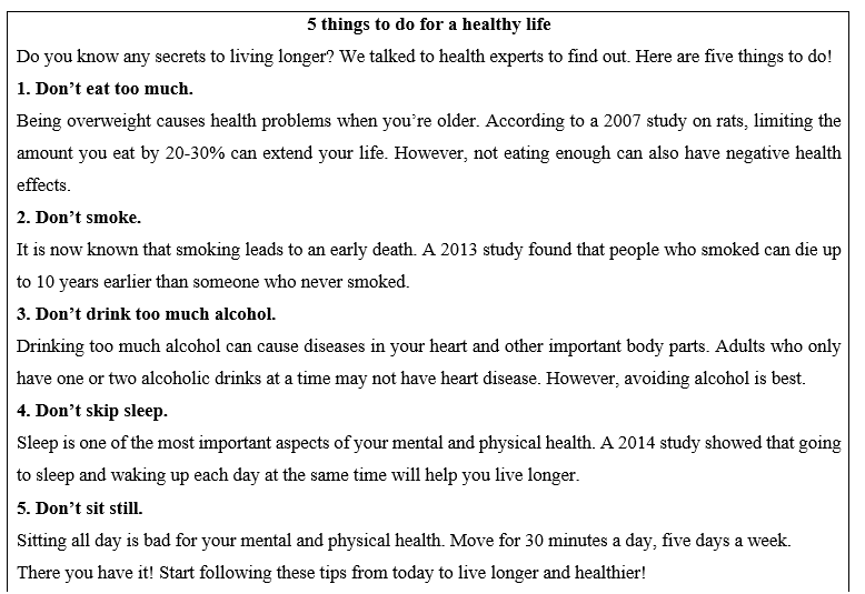 (Bây giờ, hãy viết một bài báo ngắn dưới dạng danh sách về những điều mọi người nên tránh để sống lâu hơn và khỏe mạnh hơn cho bản tin của trường bạn. Viết về ít nhất bốn lời khuyên. Sử dụng phần Kỹ năng viết và ghi chú lập kế hoạch của bạn để giúp bạn. Viết 150-180 từ.)