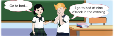 I go to bed at nine o’clock in the evening. (Tớ đi ngủ lúc 9 giờ tối.)