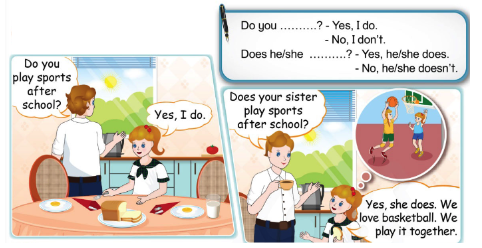 – Does your sister play sports after school? (Em gái của bạn có thích chơi thể thao sau giờ học không?)
