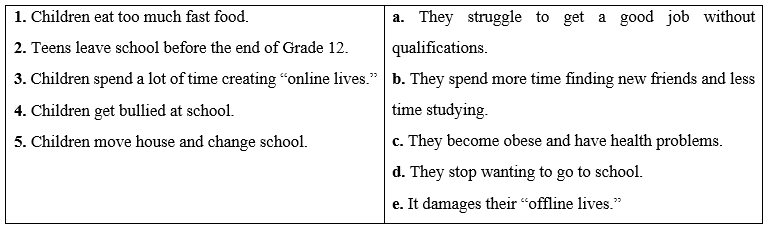 (Đọc về cách viết bài luận về nguyên nhân và ảnh hưởng. Nối các nguyên nhân với các ảnh hưởng.)