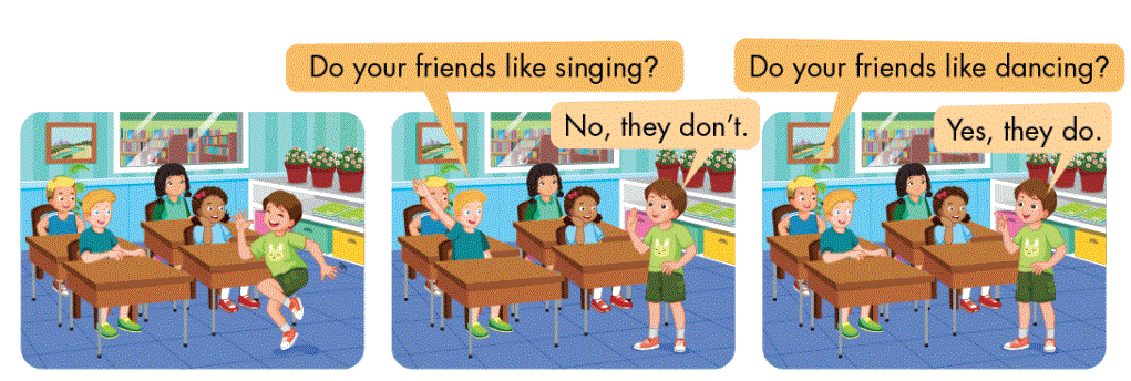 Ví dụ: Một bạn sẽ dùng hành động để diễn tả nhảy múa, các bạn dưới lớp sẽ đặt câu hỏi: “Do your friends like singing? hoặc “Do your friends like dancing?”…