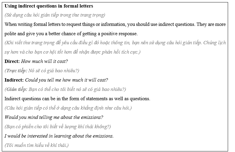 Read about using indirect questions in formal letters. Rewrite the questions to be indirect using the prompts.