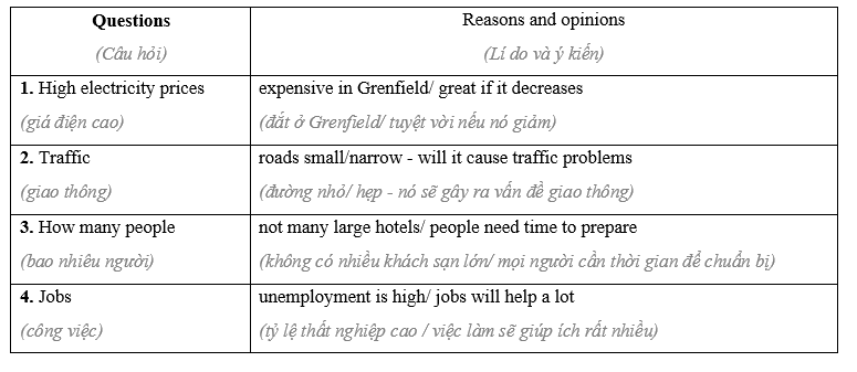 (Bạn là một phóng viên đang nghiên cứu cho một bài viết về một đập thủy điện mới đang được xây dựng ở Grenfield. Đọc về Grenfield và hoàn thành bảng với bốn câu hỏi. Đưa ra lý do và ý kiến cho mỗi câu hỏi.)