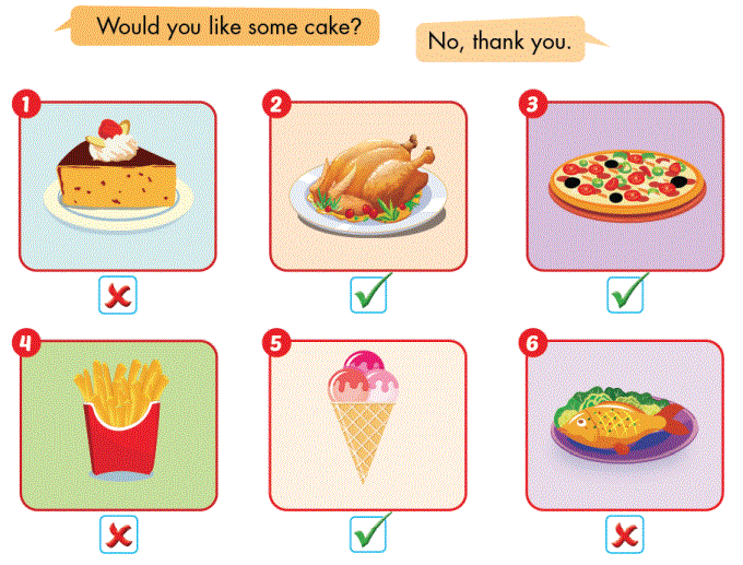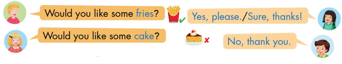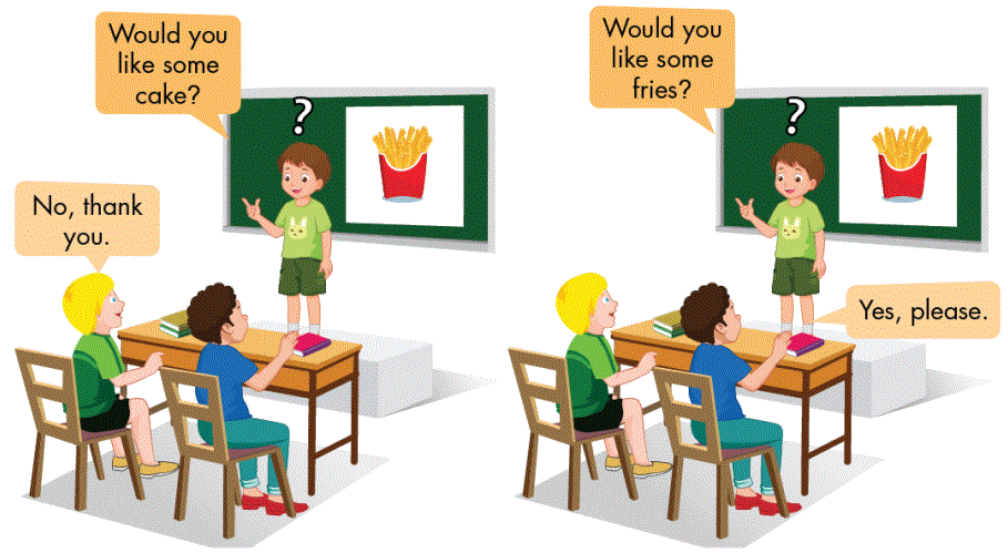 Bạn đoán sẽ đặt câu hỏi: “Would you like some cake?” hoặc “Would you like some fries?”… Các bạn dưới lớp chỉ cần trả lời “Yes, please.” nếu đúng, sai thì nói “No, thank you.”
